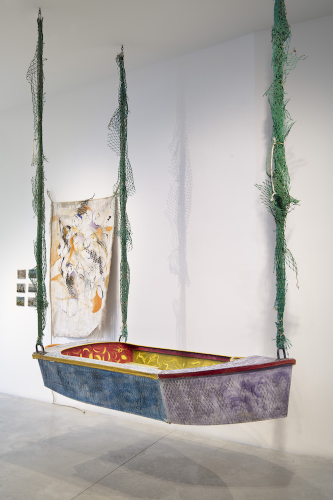 Marine-grade plywood, salvaged wood, Titebond III, steel, fiberglass, cadmium orange, cadmium red, crap green, iron oxide, ultramarine blue, ultramarine purple, graphite, Thompson’s WaterSeal, duct tape, fishing net salvaged from Long Island fishery, and rope, 48 × 96”.